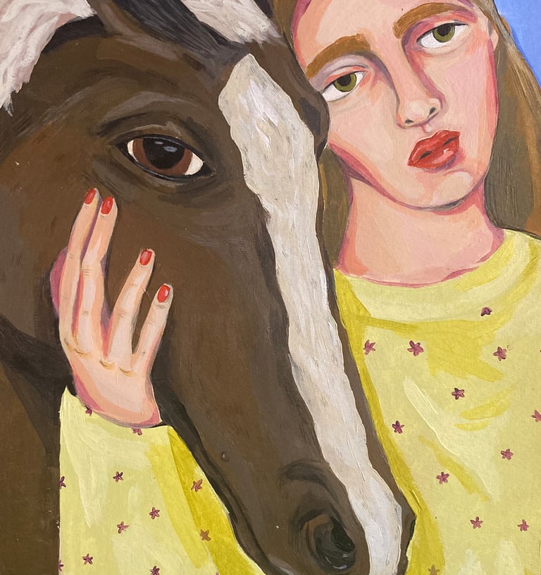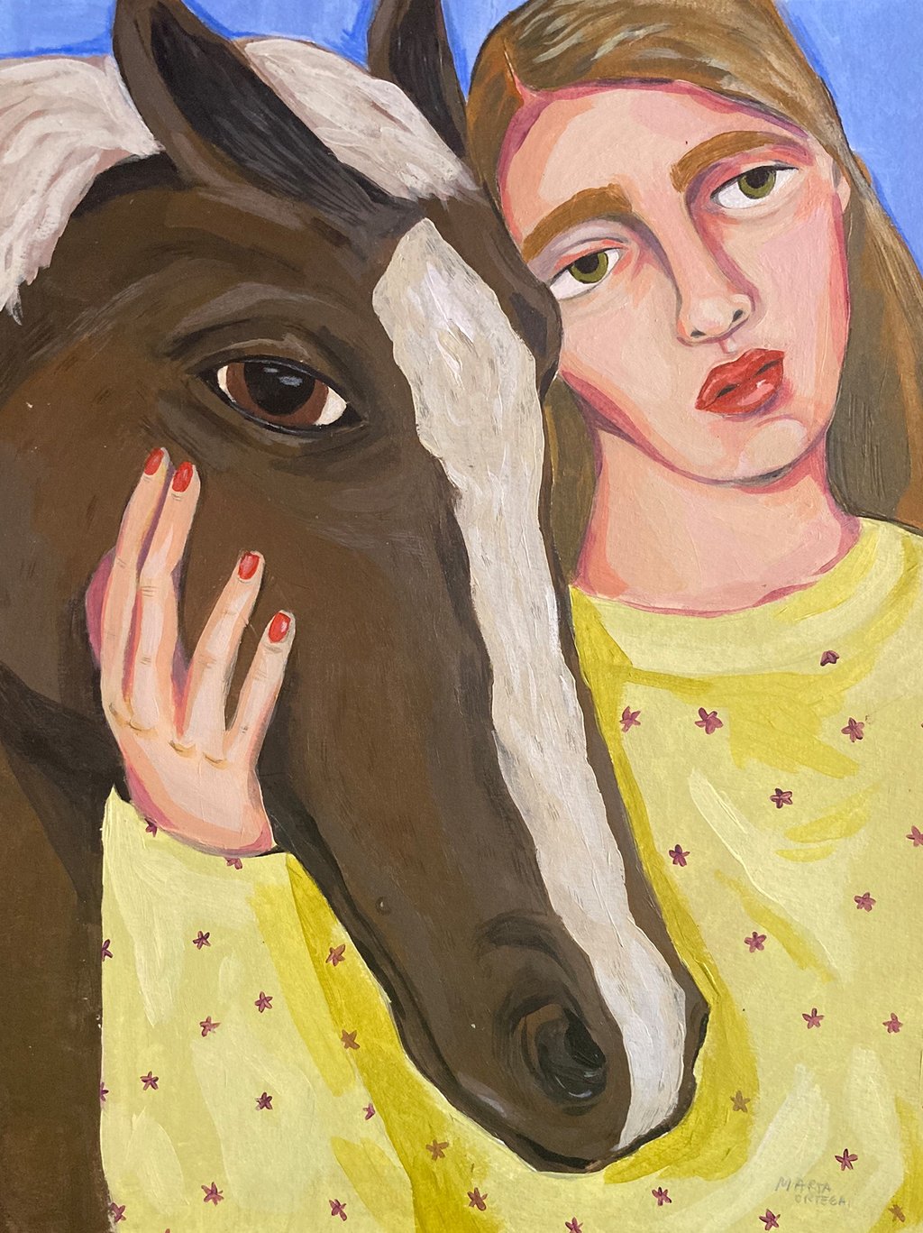 Desde una perspectiva personal y con el estilo habitual que caracteriza los retratos de la artista, Carmen, Alicia y un Galgo español protagonizan la representación del afecto que existe entre ellos.