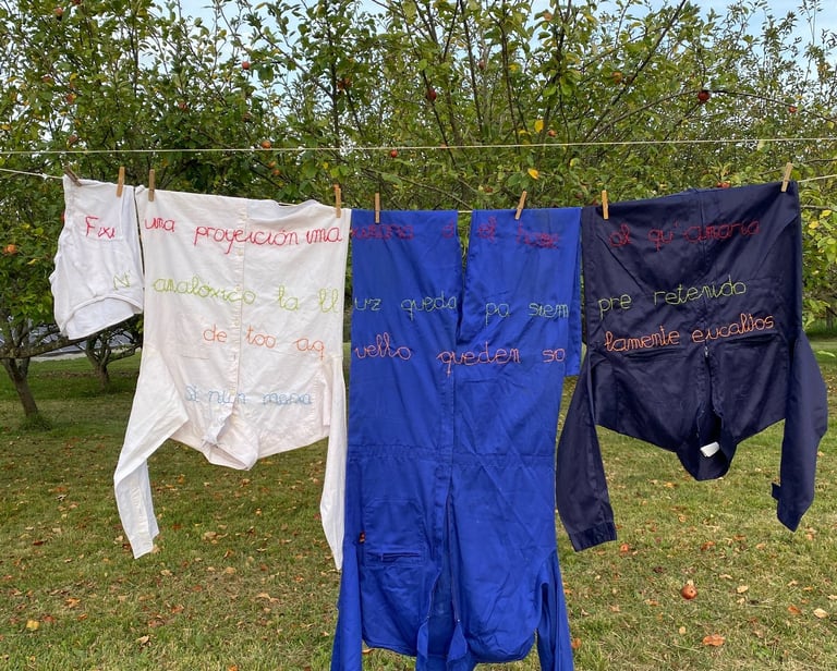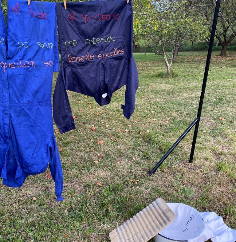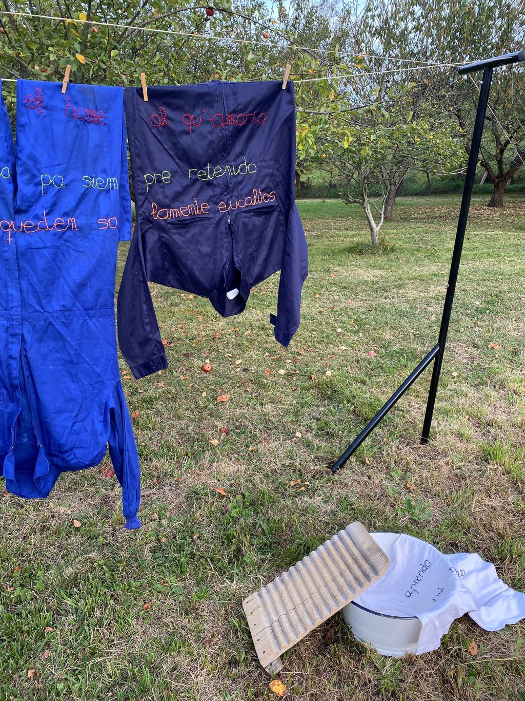 En la instalación Filu - pallabra, este reencuentro y reconciliación entre pasado y futuro se materializa en dos ejes principales. Por un lado, para la artista la tradición toma forma a través de lo textil. Recibe este legado de sus dos abuelas y su madre, que tenían una habilidad excepcional para coser, tejer y bordar. El mono de trabajar en el campo, la ropa interior, la camisa de los domingos… todos estos objetos son susceptibles de transformación a través del bordado.